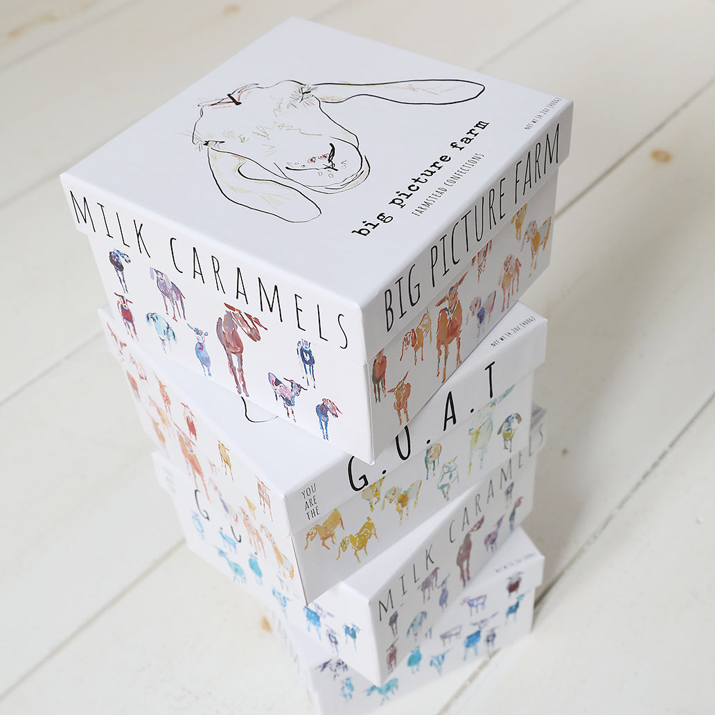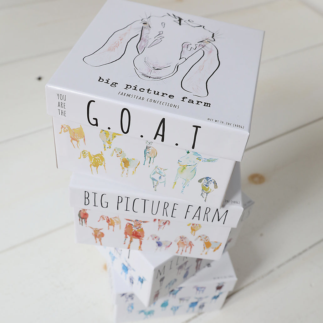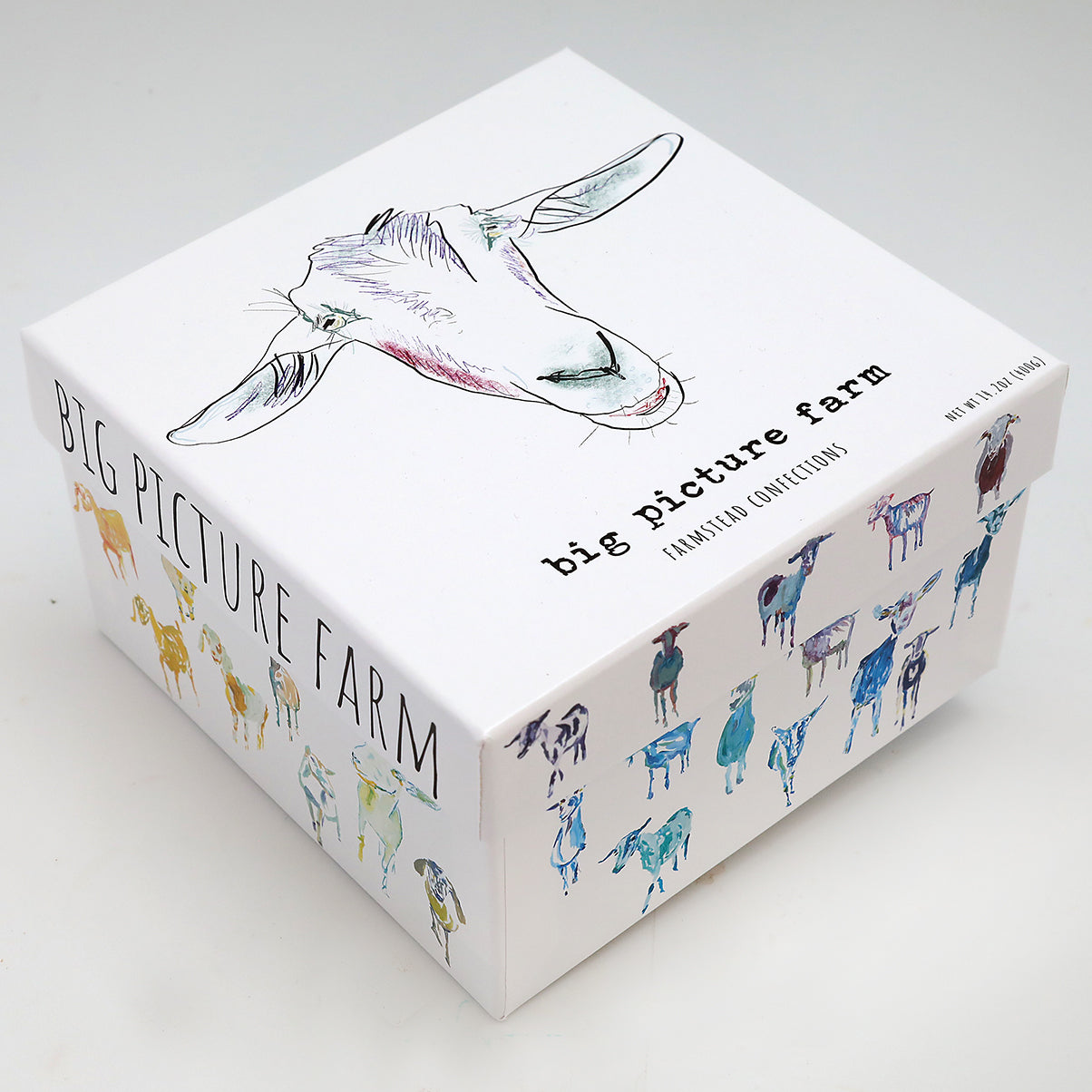 Big Picture Farm is committed to making the finest, most delicious caramels in the world. Our secret ingredient is our milk -- we use fresh, creamy, delicious milk from our own herd of happy and healthy, free-browsing companions. Our Farmstead Goat Milk Caramels have been awarded more than a dozen national awards including Best Confection four times at the Fancy Food Show and three Good Food Awards.  View the ingredients here.