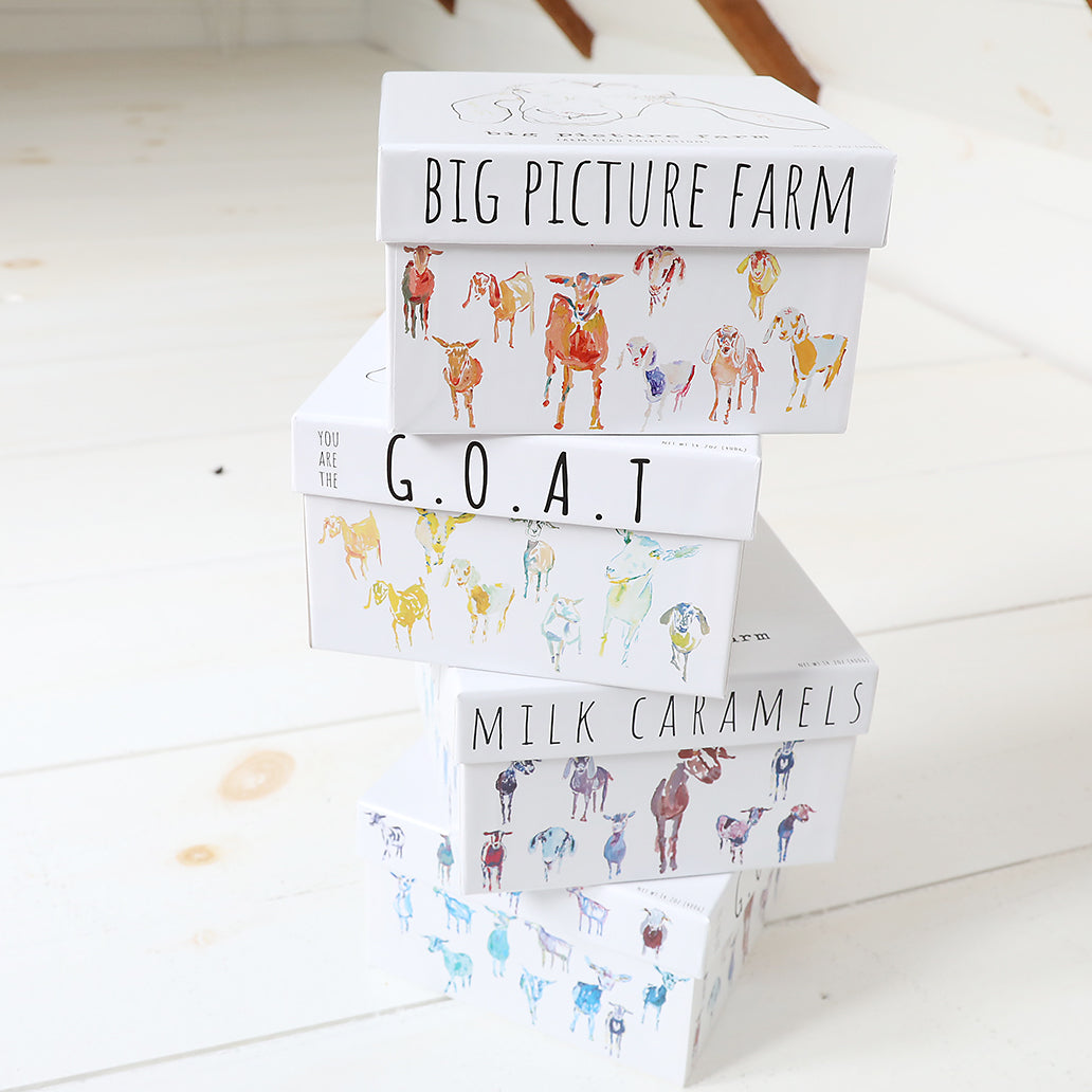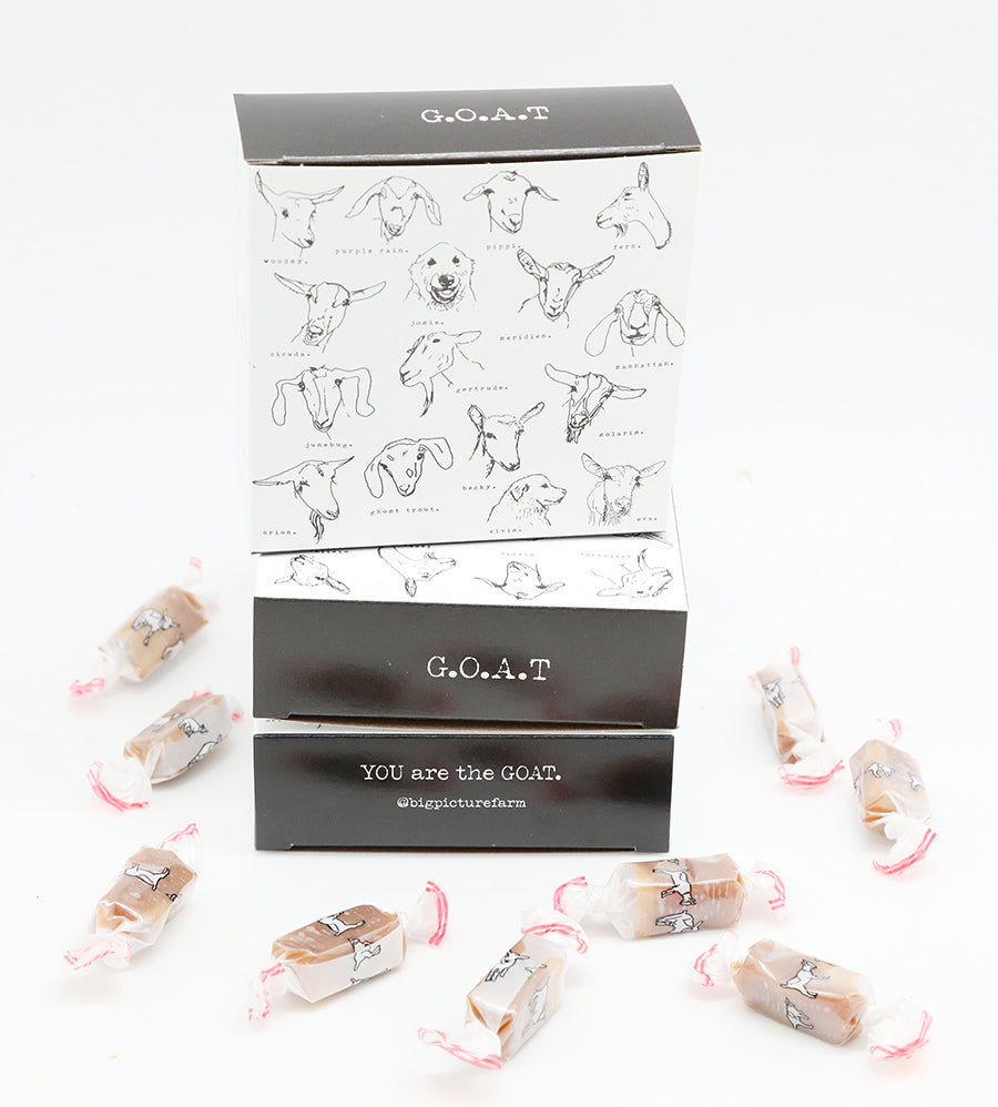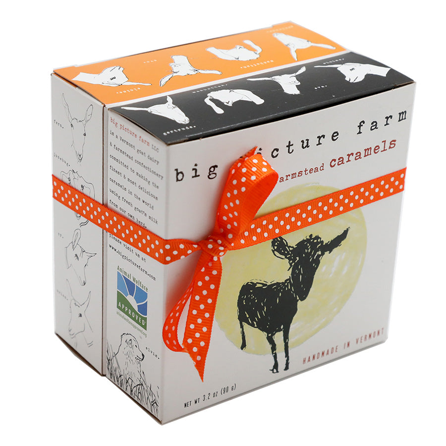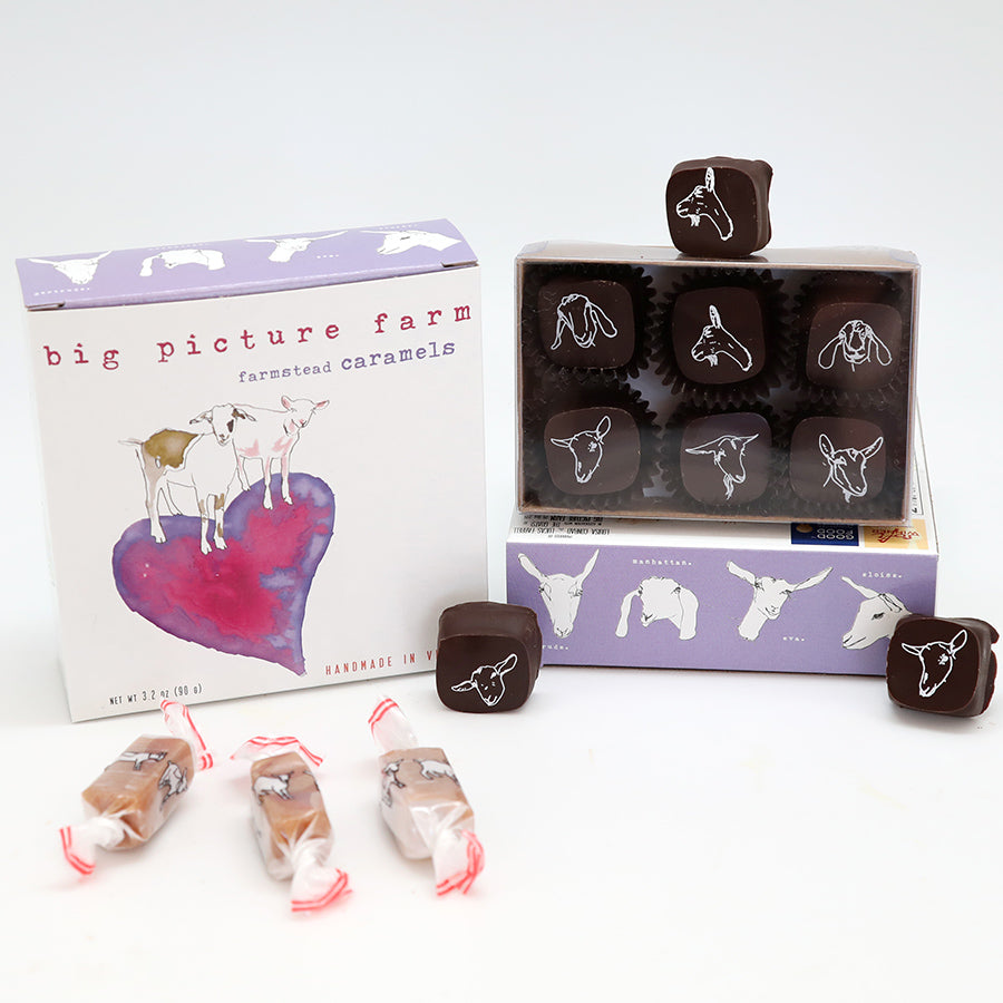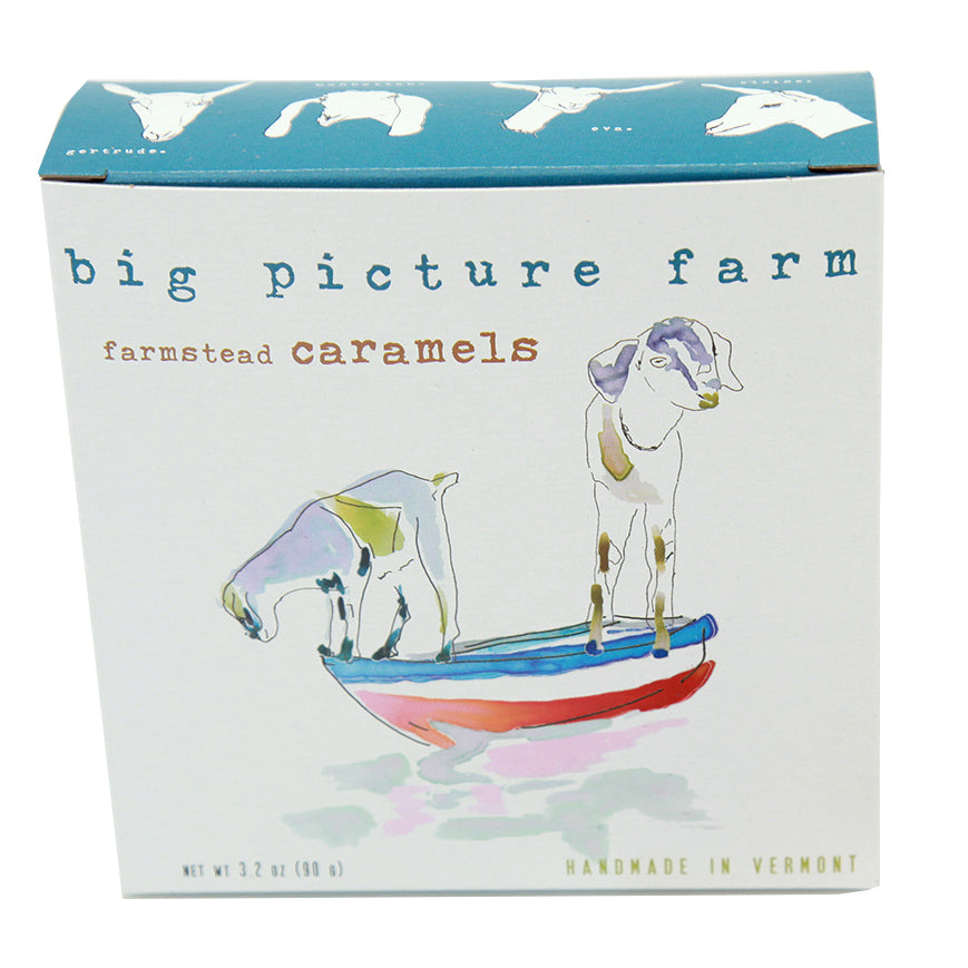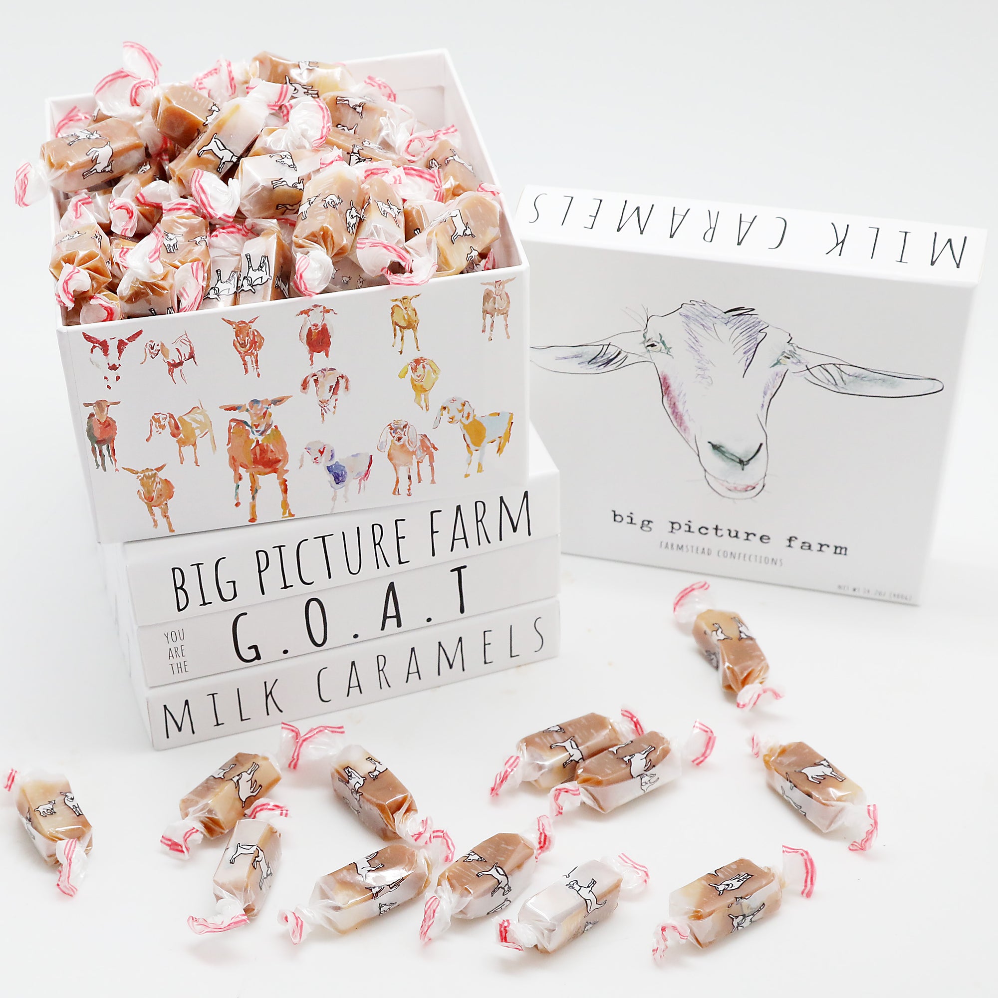 Big Picture Farm is committed to making the finest, most delicious caramels in the world. Our secret ingredient is our milk -- we use fresh, creamy, delicious milk from our own herd of happy and healthy, free-browsing companions. Our Farmstead Goat Milk Caramels have been awarded more than a dozen national awards including Best Confection four times at the Fancy Food Show and three Good Food Awards.  View the ingredients here.