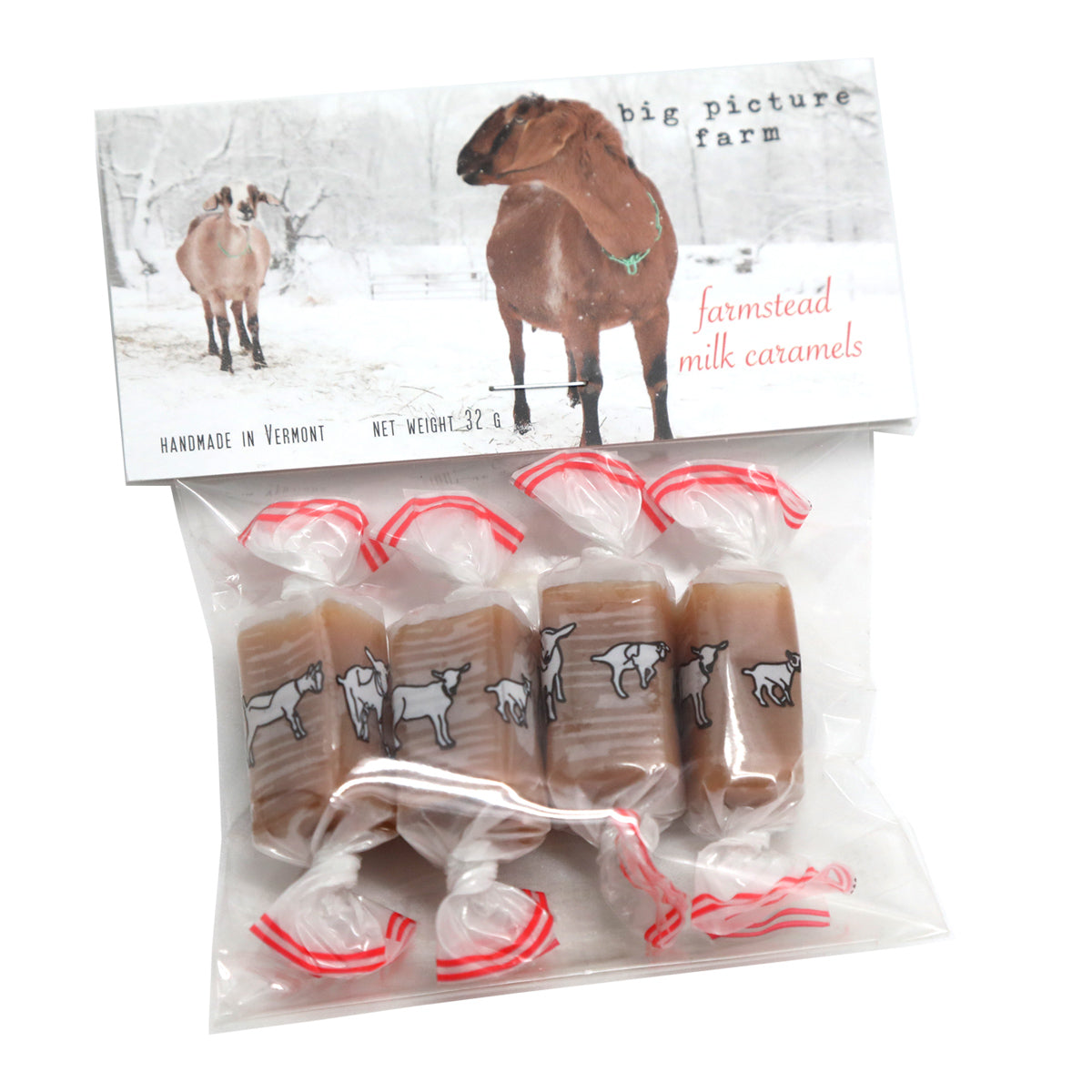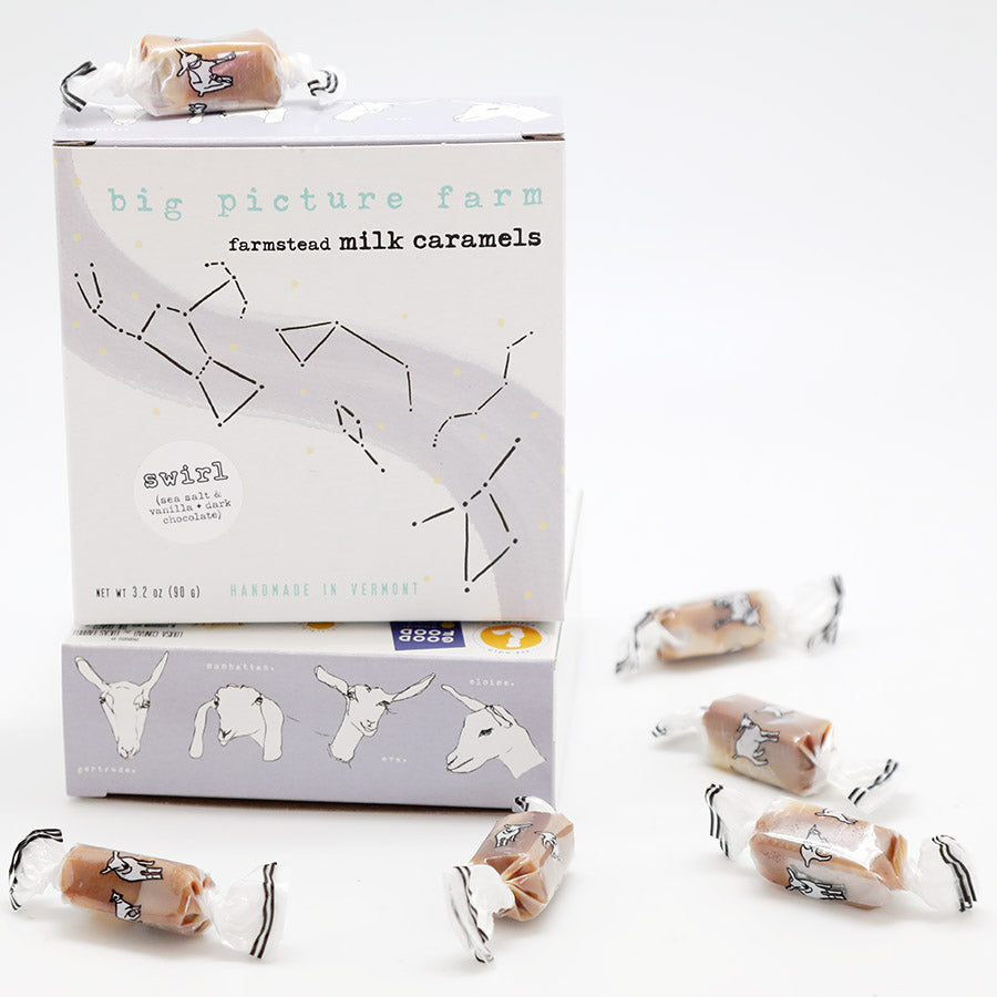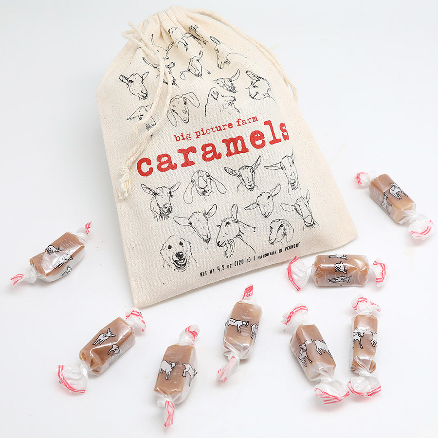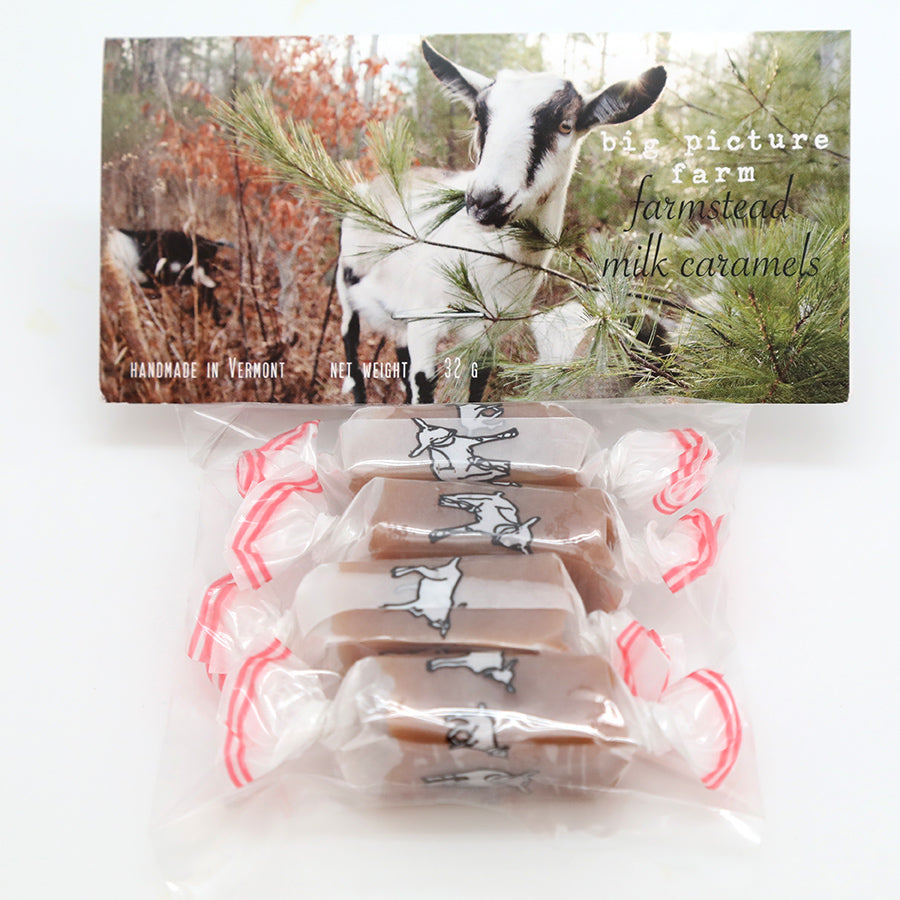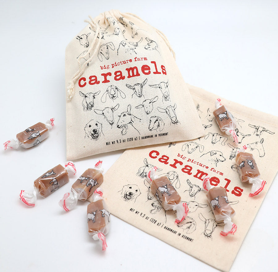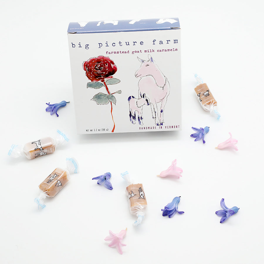 Big Picture Farm is committed to making the finest, most delicious caramels in the world. Our secret ingredient is our milk -- we use fresh, creamy, delicious milk from our own herd of happy and healthy, free-browsing companions. Our Farmstead Goat Milk Caramels have been awarded more than a dozen national awards including Best Confection four times at the Fancy Food Show and three Good Food Awards.  View the ingredients here.