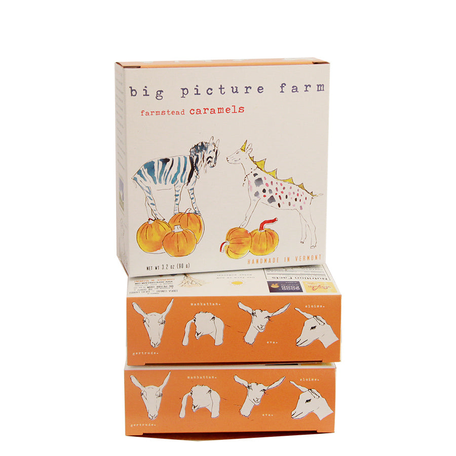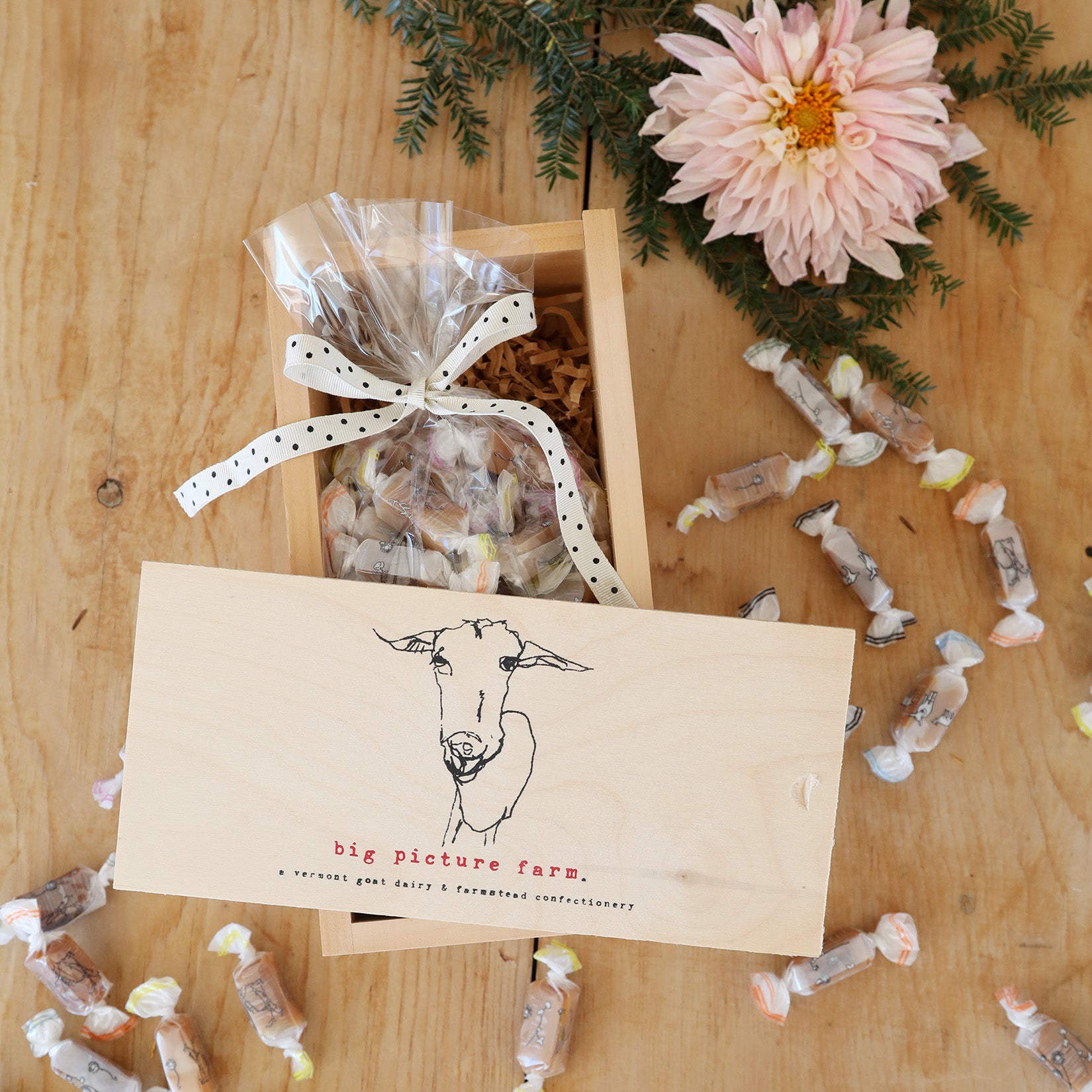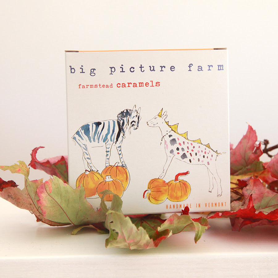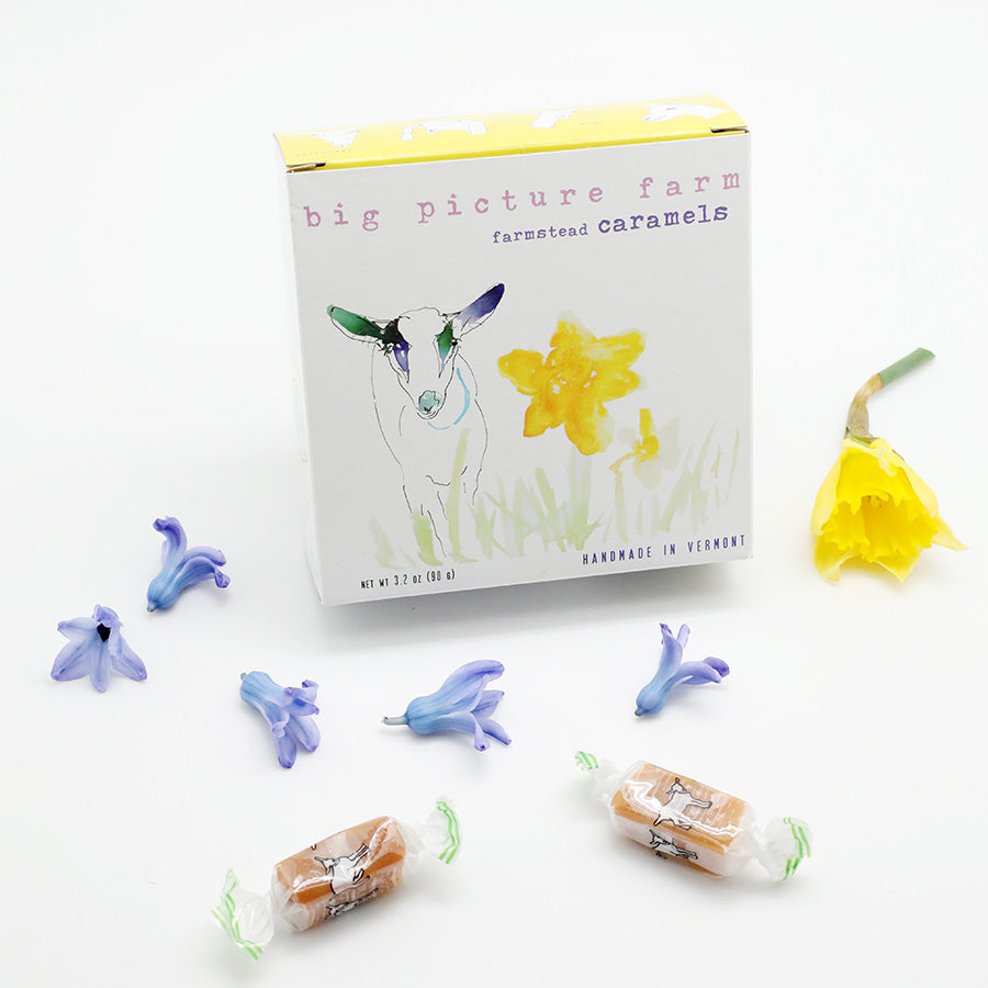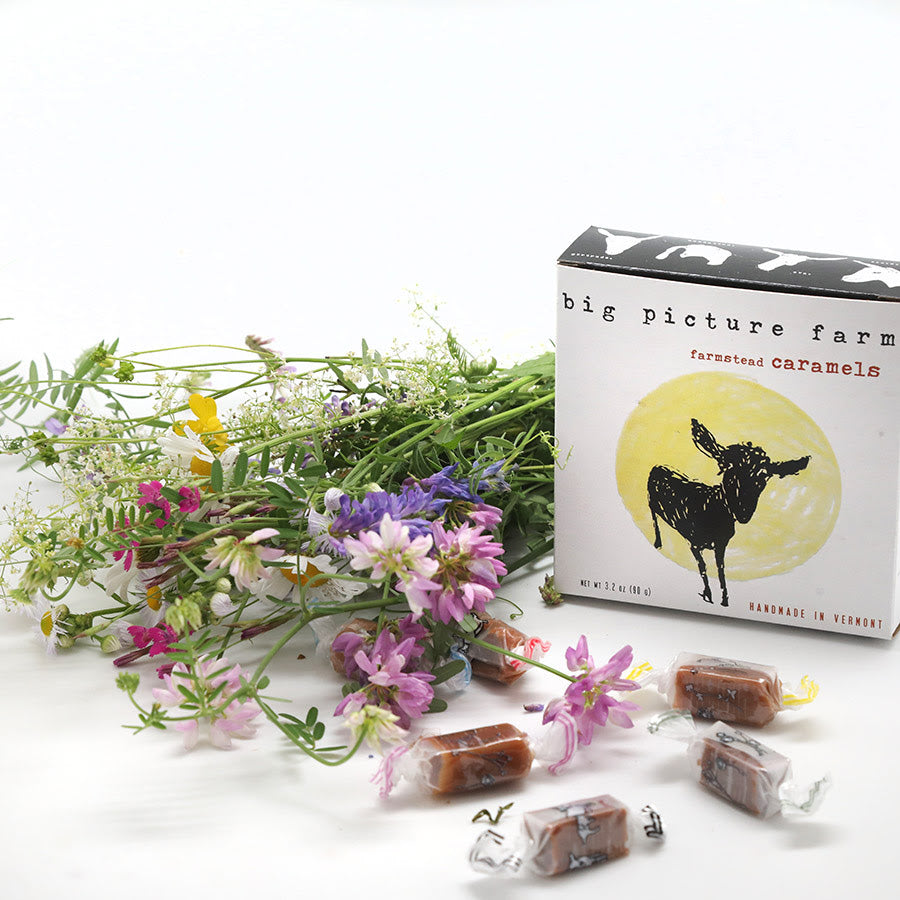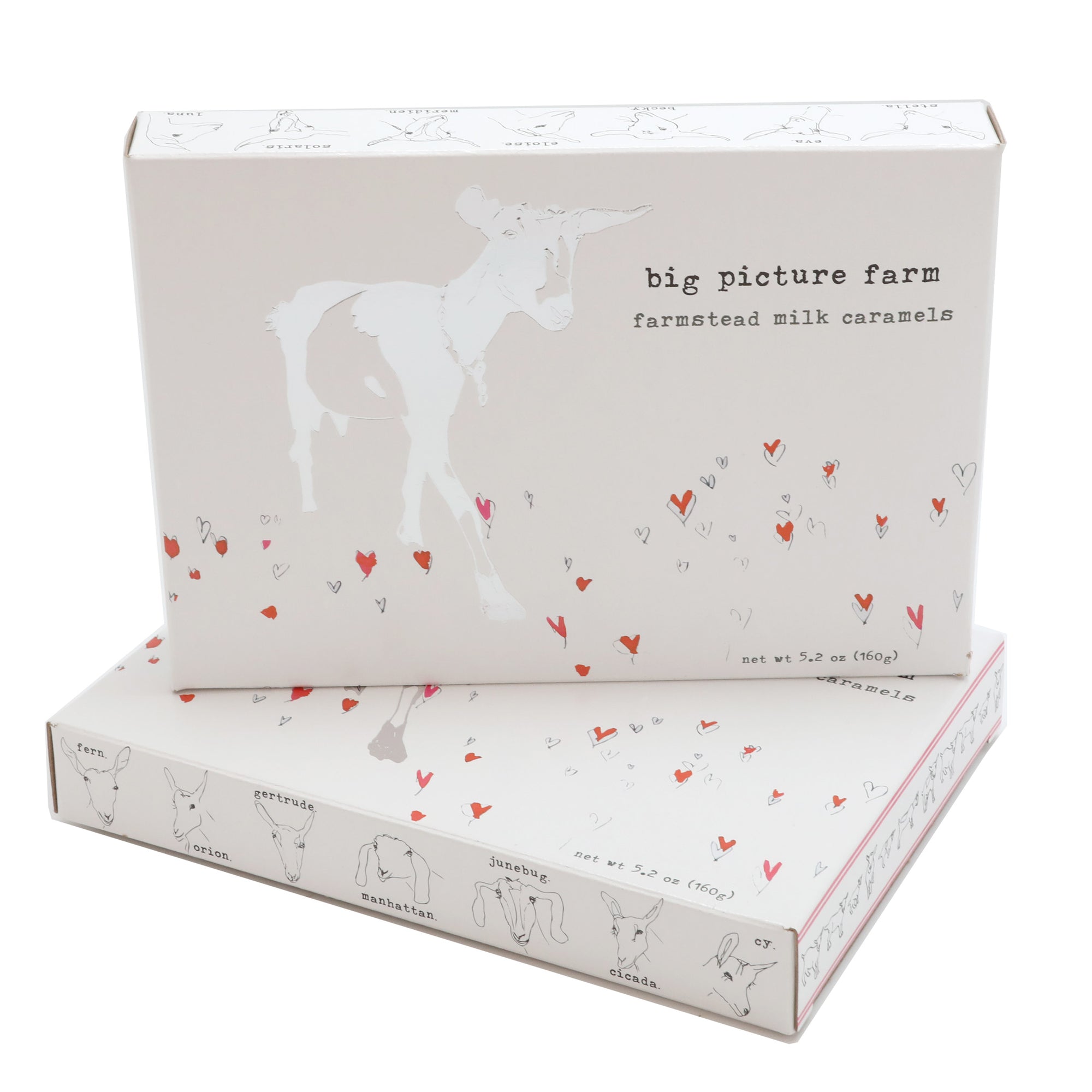 Big Picture Farm is committed to making the finest, most delicious caramels in the world. Our secret ingredient is our milk -- we use fresh, creamy, delicious milk from our own herd of happy and healthy, free-browsing companions. Our Farmstead Goat Milk Caramels have been awarded more than a dozen national awards including Best Confection four times at the Fancy Food Show and three Good Food Awards.  View the ingredients here.