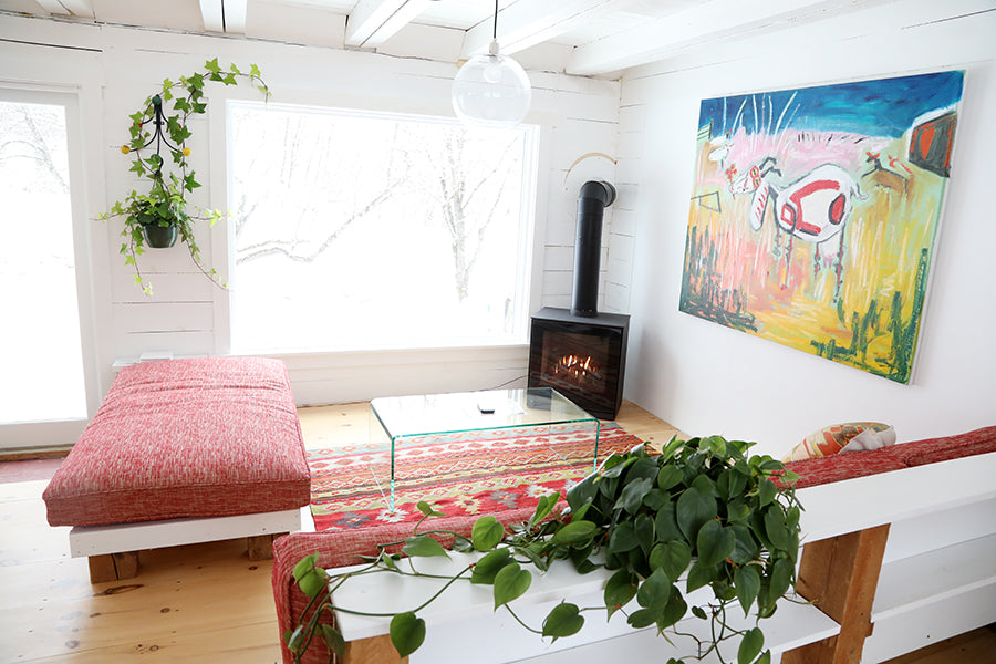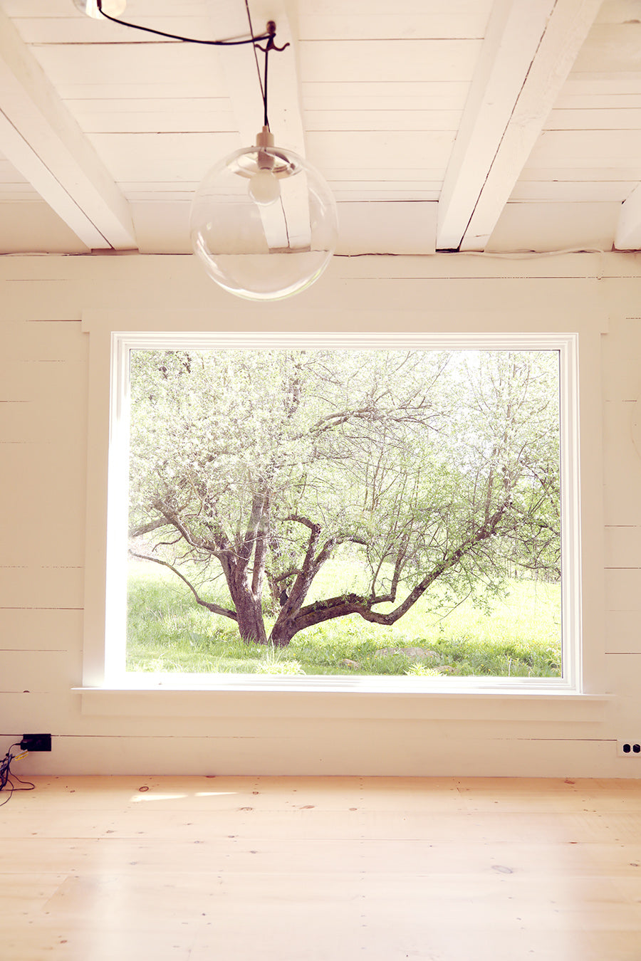 - Built-in seating area with picture window into wild apple tree grove